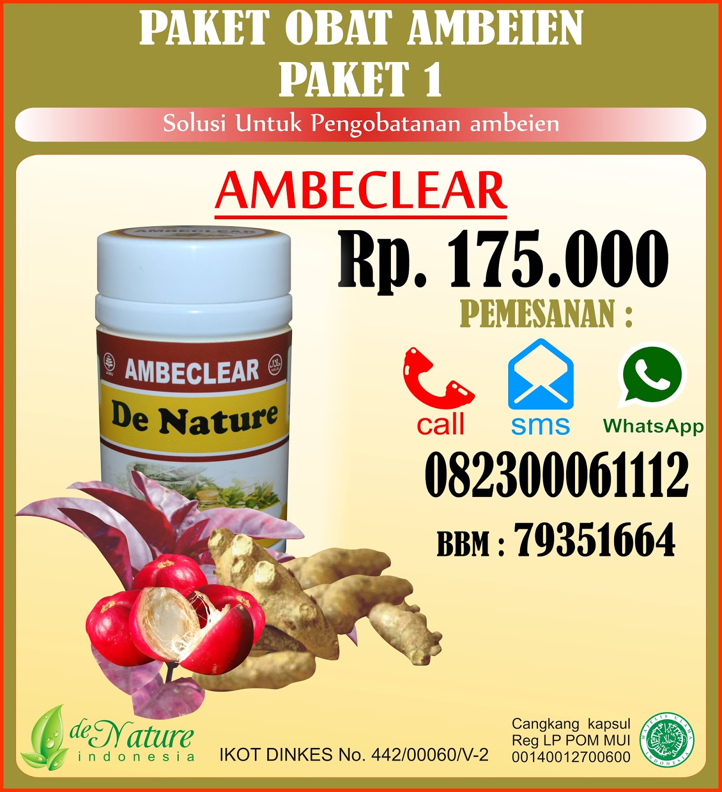 AMBECLEAR obat Ambeien atau obat wasir, Obat alami berkhasiat dalam bentuk kapsul yang berasal dari tanaman herbal seperti daun ungu, mahkota dewa dan kunyit putih, diberikan pada penderita jika penyakit masih dalam tingkatan stadium ringan. Kapsul ini biasanya dikemas dalam jumlah sebanyak 50 kapsul.